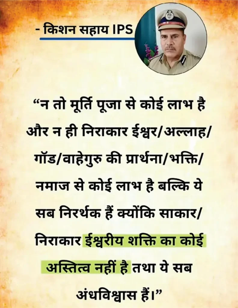 भारतीय पोलीस सेवेतील (IPS) एक वरिष्ठ पोलीस अधिकारी म्हणून कार्यरत असलेले किशन सहाय हे त्यांच्या प्रशासकीय जबाबदार्यांबरोबरच त्यांच्या स्पष्ट आणि तर्कशुद्ध विचारांसाठी अधिक ओळखले जातात. राजस्थान केडरचे अधिकारी असूनही, त्यांचे विचार केवळ एका विशिष्ट प्रांतापुरते मर्यादित नसून, त्यांनी भारतातील सामाजिक आणि धार्मिक रूढीवादी विचारधारेला थेट आव्हान दिले आहे. ते सध्या राजस्थान पोलीस दलामध्ये मानव अधिकार विभागाचे आय.जी. म्हणून काम करतात.