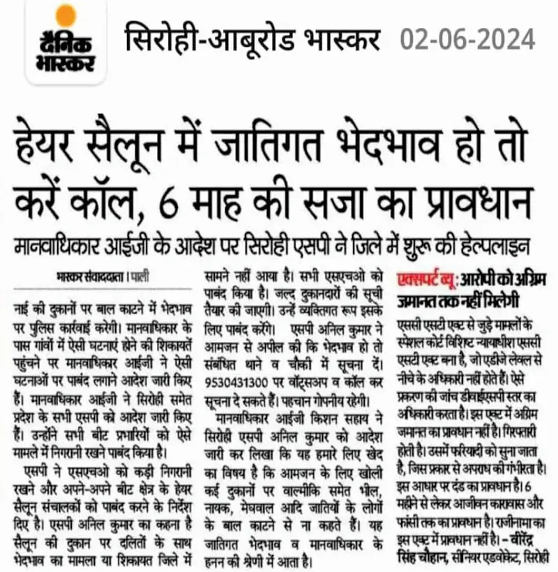 किशन सहाय : मी सोशल मीडियावर सक्रिय आहे. मी फेसबुकवर एक पोस्ट अस्पृश्यतेच्या विरोधात आणि जातिभेद नष्ट करण्यासाठी लिहिली होती. आधी अस्पृश्यता संपवणे आवश्यक आहे, कारण अस्पृश्यतेमुळे जातीयवादाला चालना मिळते. मी केस कापण्याची (हेअर सलून) दुकाने सर्वसामान्य जनतेसाठी आहेत, असे लिहिले होते. एका गावात दलितांचे केस काही हेअर सलूनमध्ये कापले जात नाहीत, अशी तक्रार माझ्याकडे आली. माझ्याकडे आलेल्या या तक्रारीच्या आधारे मी एक आदेश काढला होता. दलितांचे केस कापण्यामध्ये जे सलून मालक भेदभाव करतील, त्यांच्यावर पोलिसांनी त्वरित कारवाई करावी. मी माझ्या सर्व अधिकार्यांना आपल्या कार्यक्षेत्रातील सर्व केसकर्तन दुकानदारांना लेखी नोटिसा द्याव्यात असा आदेश दिला. यामुळे मोठा फरक पडला. भारतात आडनावावरून जात शोधली जाते. त्यामुळे मी माझ्या नावामध्ये आडनाव लावत नाही. माझ्याकडे येणार्या सर्व प्रस्तावांमध्ये कर्मचार्यांच्या आडनावाचा उल्लेख करू नका, अशा मी सूचना दिल्या आहेत.