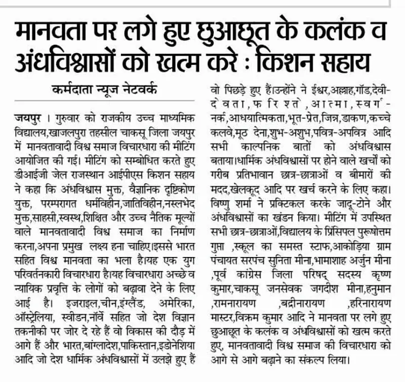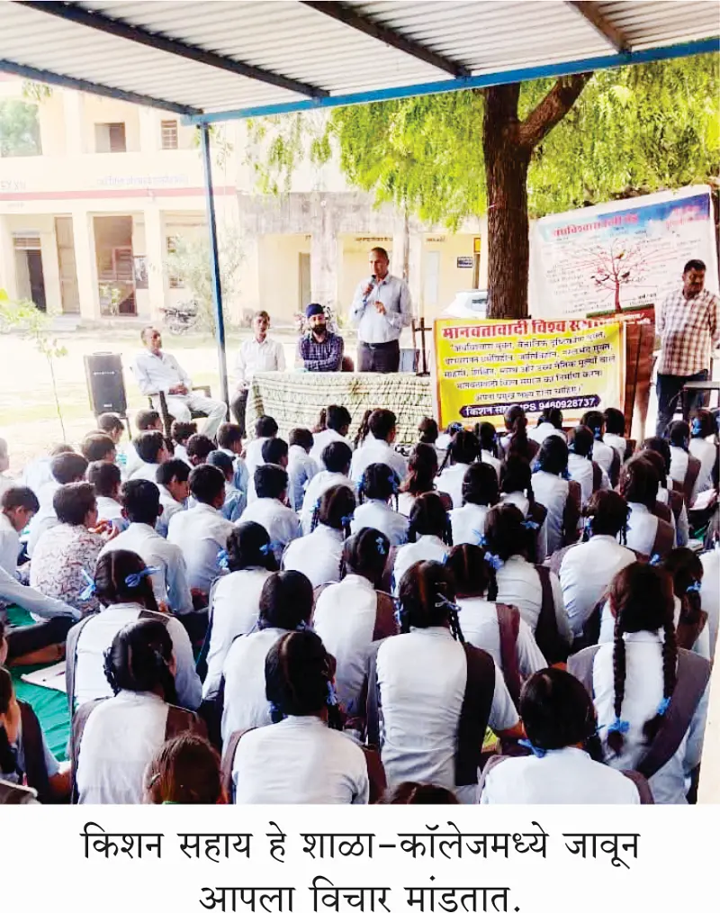 किशन सहाय : पहा, मी अंधश्रद्धा निर्मूलनासाठी आजपर्यंत हजारो सभा घेतल्या आहेत. शाळा, महाविद्यालयं, गावं, खेडी, कोचिंग सेंटर, मोहल्ले अशा सर्व ठिकाणी. मानवतावादी विश्व समाज यांच्या माध्यमातून हे काम सुरू आहे. मानवतावादी विश्व समाज एक असा विचार आहे. या समाजात कोणत्याही जाति-धर्मातील मुले-माणसं सहभागी होऊ शकतात, हे सर्वांसाठी खुले आहे. मानवतावादी विश्व समाजात फक्त अंधश्रद्धा निर्मूलनच नाही, तर जातव्यवस्था संपवण्याची, शिक्षणाचा प्रसार करण्याची, खेळ-क्रीडा आणि संपूर्ण जीवन जगण्याच्या मार्गाचीही चर्चा होते.