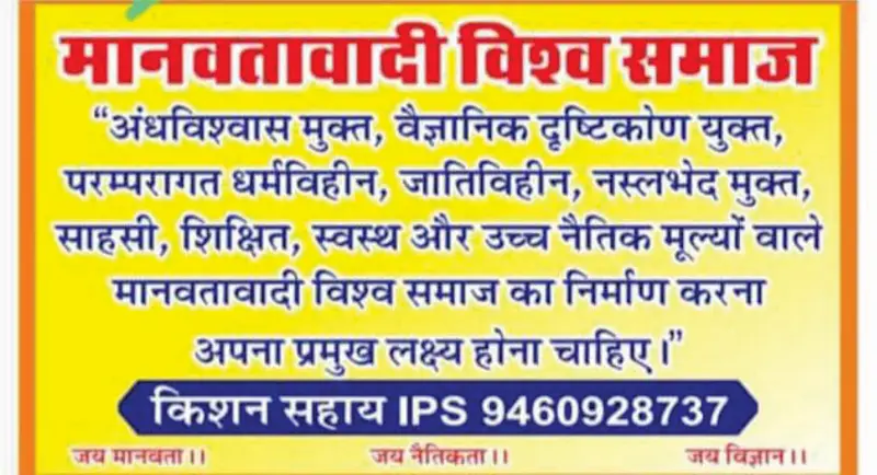 मानवतावादी विश्व समाज "अंधविश्वास मुत, वैज्ञानिक दृष्टिकोनयुत, परंपरागत धर्मविहीन, जातिविहीन, नस्लभेद मुत, साहसी, शिक्षित, स्वस्थ और उच्च नैतिक मूल्योंवाले मानवतावादी विश्व समाज का निर्माण करना अपना प्रमुख लक्ष्य होना चाहिए।” - किशन सहाय IPS मो. ९४६०९२८७३७