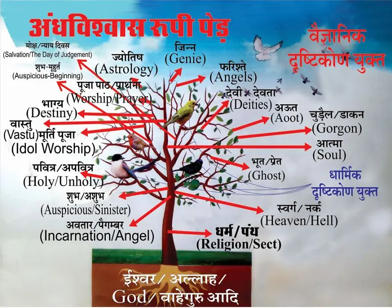 पारंपरिक जे धर्म आहेत या धर्माची गरज आता या वैज्ञानिक काळात नाही. कारण, या पारंपरिक धर्मामध्ये खूप मोठ्या अंधश्रद्धा आहेत. ईश्वर, अल्ला, गॉड यांच्याकडून मुती मिळेल ही अंधश्रद्धा आहे. अल्ला, गॉड, ईश्वर, जन्नत, जहन्नम, स्वर्ग, नरक या काल्पनिक गोष्टी आहेत, अंधश्रद्धा आहेत. देव-देवता, फरिश्ते, भूत-प्रेत, मोक्ष, न्यायाचा दिवस, अवतार या सगळ्या फसव्या कल्पना आहेत. शुभ-अशुभ, पवित्र-अपवित्र अशी काही गोष्ट नसते. ह्या सगळ्याला आपण ‘अंधश्रद्धा’ म्हटले आहे.